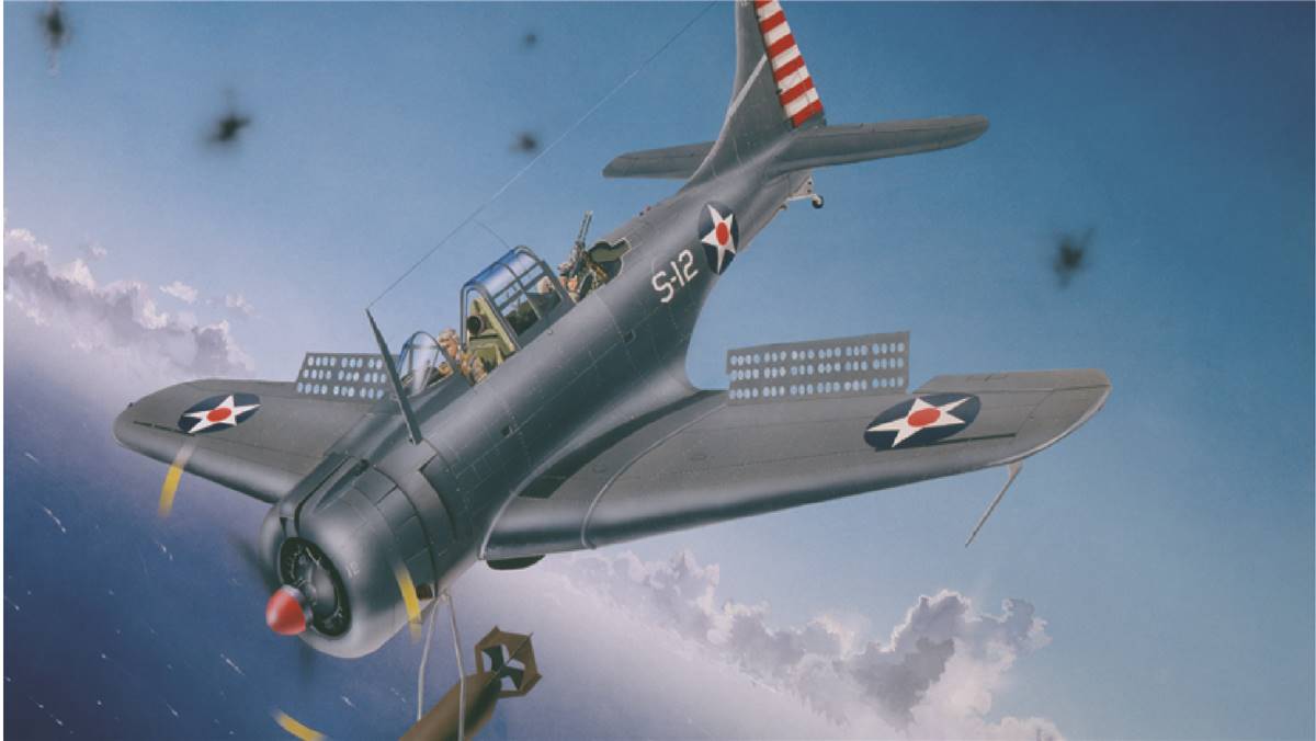 The SBD Dauntless dive bomber became a mainstay of the Navy's air fleet in the Pacific, with the lowest loss ratio of any U.S. carrier-based aircraft. A total of 5,936 SBD/A-24s were delivered between 1940 and the end of production in July 1944. The SBD Dauntless featured "Swiss cheese" flaps dive brakes punched with 3-inch holes so that it could achieve pinpoint accuracy by diving to the target, dropping the bomb and then pulling out of the near-vertical dive. In addition to the U.S. Navy, Marine Corps and Army Air Forces, the Dauntless served forces in New Zealand and Mexico. The first enemy ship sunk by the U.S. Navy in World II is credited to a Dauntless from the USS Enterprise. The diving Dauntless went on to destroy 18 enemy warships, including a battleship and six carriers. The SBD-3 which appeared in March 1941 had O5Os in the cowling. Self-sealing tanks were introduced, as well as protective armor, and the engine was the 1,000 hp R-1820-52. The SBD-4. The latter differed only in going over to a 24-volt system; 780 were built for the Navy. Wingspan: 12.7m Length: 9.8m Height: 4.1m Ceiling: 8260m Range: 2165km Weight: 2878kg Power plant: 1,000-hp R-1820-52 engine Speed: 402km/h Crew: Two